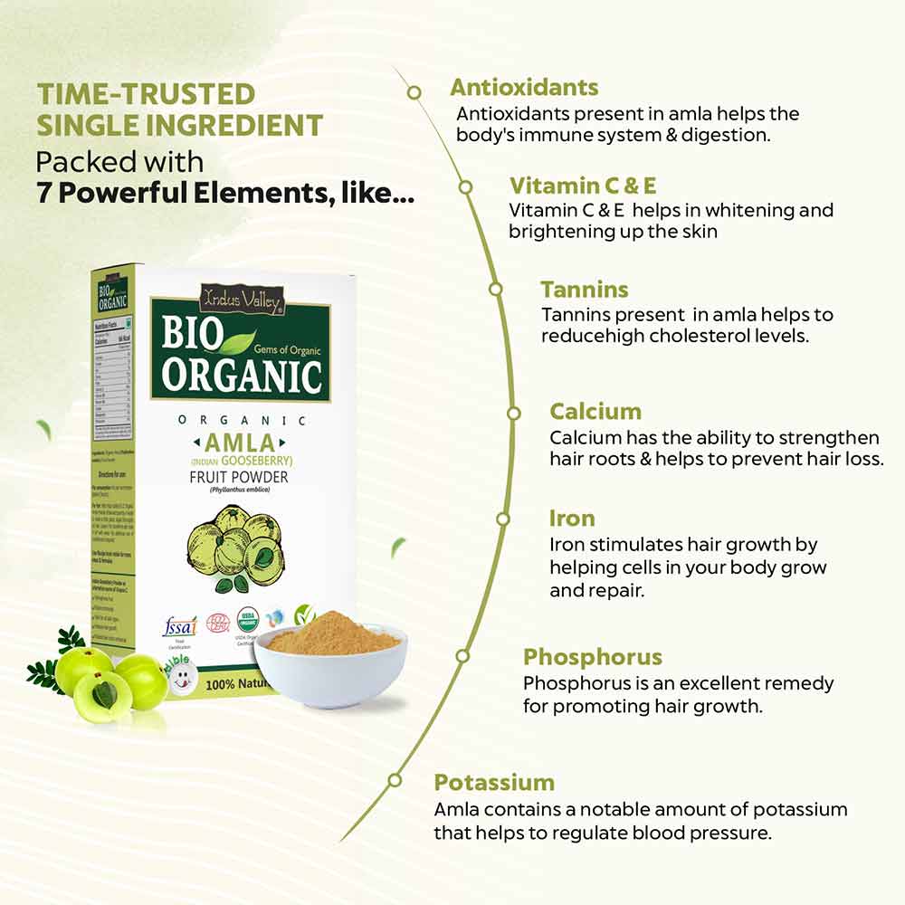 Indus Valley Bio-Organic Amla Powder is obtained from organically grown fruits of amla (Phyllanthus emblica) trees, also called Indian Gooseberry. The fruits are farm-picked fresh, shade-dried, crushed into a microfine, triple-sifted powder and then packed fresh without any added preservatives, fragrances or colourants. A super-rich source of vitamin C, tannins, phosphorus, iron and calcium, you can use it regularly to get multiple skin, hair and health benefits.