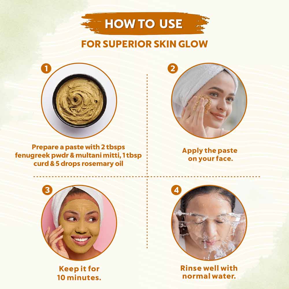 Fenugreek seed powder is naturally rich in skin-loving nutrients such as vitamin C, dietary fibre, essential fats, iron, magnesium, phosphorus, and vitamins A and B-complex. These nutrients work together to help address common skin concerns while supporting a clear, nourished, and healthy-looking complexion.