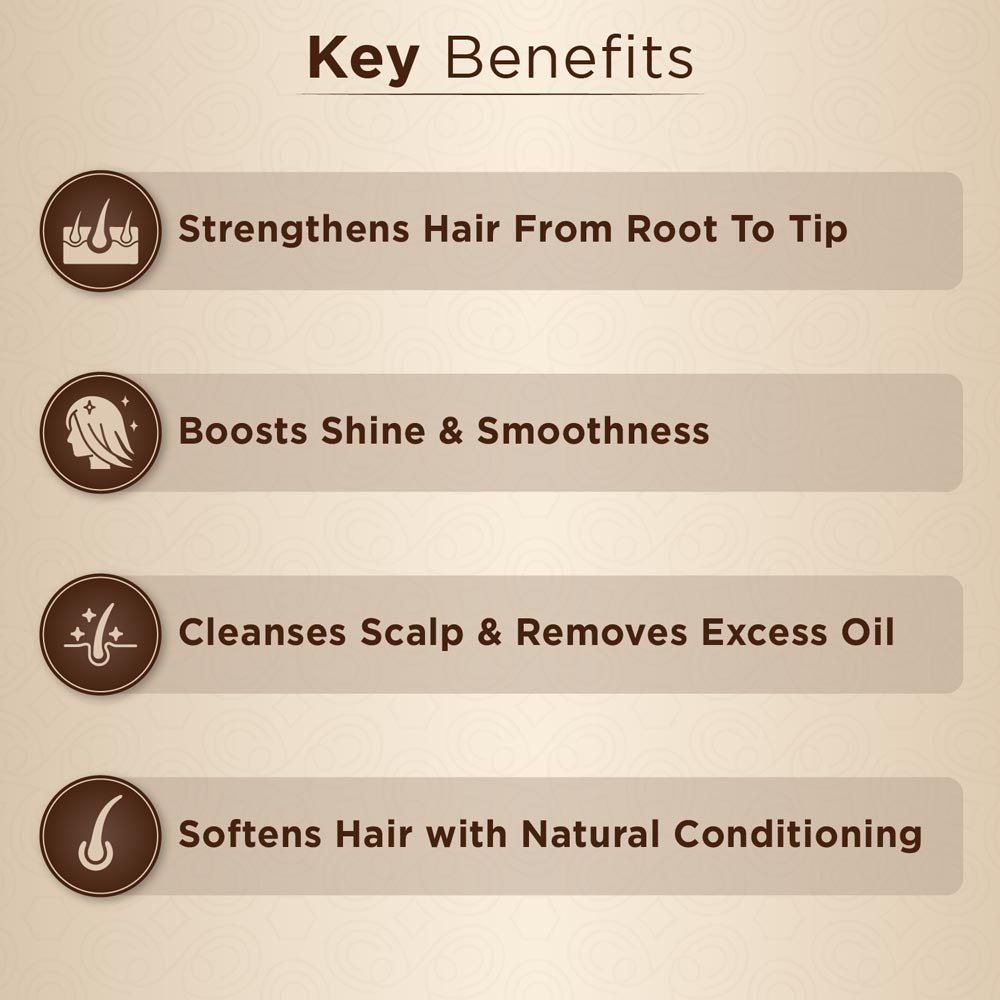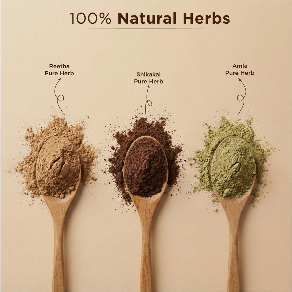 Shikakai is a well-known natural scalp cleanser along with being a wonderful source of vitamin C. It helps hair to grow longer, stronger, shinier, softer, and gives the scalp a collagen boost. It cleans with mild lather and is gentle on the scalp and hair. It also improves the texture of hair. The antifungal properties of shikakai soothe the scalp and fight dandruff. Vitamins present in this herb nourishes the hair follicles and prevents untimely greys. Being a cooling agent, Shikakai helps to soothe the scalp and prevent itchiness. It helps in boosting sebum production in excessively dry scalp. This magical herb helps to get silky hair that’s easy to detangle. Regular use of shikakai reduces hair damage, breakage, and prevents hair loss.
