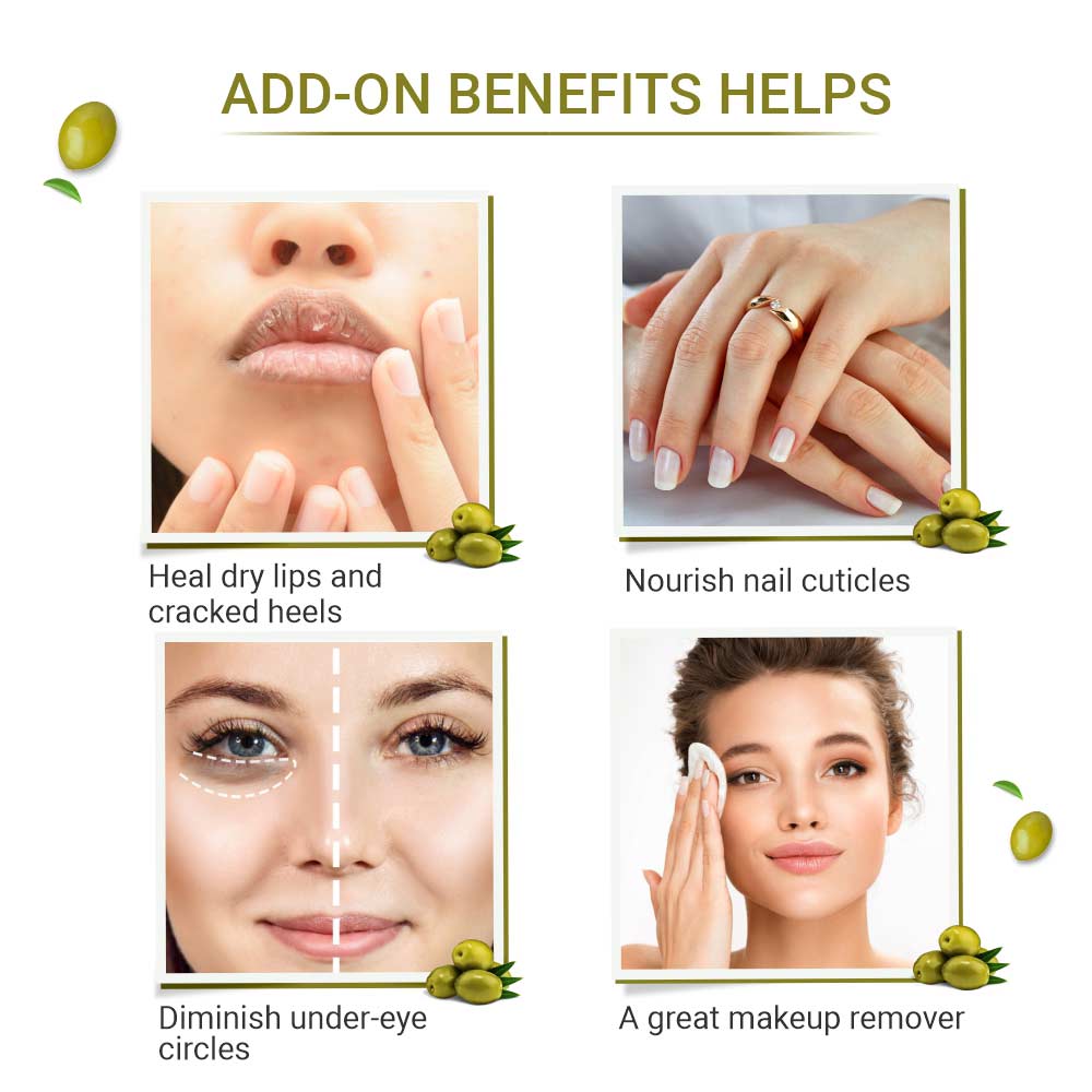 Olive oil on the skin can provide several benefits, Moisturizes and nourishes, Antioxidant protection, Soothes and calms, Improves skin elasticity, Makeup removal, Lip care etc.