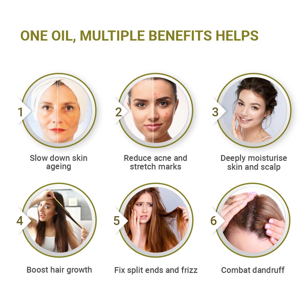 Olive oil for skin helps to lock in moisture without clogging the skin pores. It helps delay skin ageing like wrinkles, and fine lines and also fades away blemishes. Using this oil in your daily skincare routine helps heal cracked heels and chapped lips, and nourishes dry skin for a soft, supple look.
