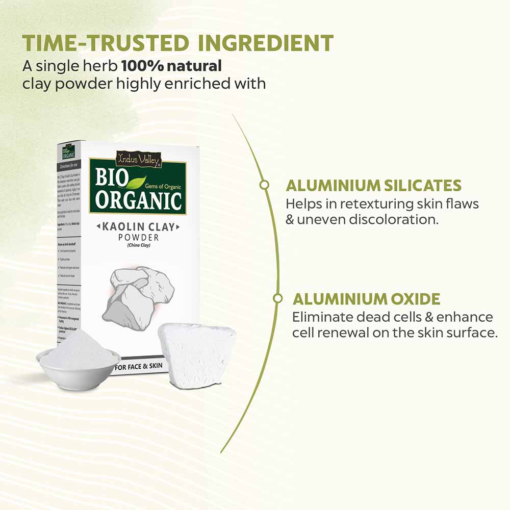 Indus Valley Bio-Organic Kaolin Clay Powder is a naturally sourced clay powder which is primarily the decomposition of aluminum silicate minerals. Kaolin clay, also known as white clay or China clay soothes dry skin, controls oily skin, combats acne breakouts, controls dandruff and other skin and hair related problems. It can be used independently or in combination with other natural ingredients to make highly effective skin cleansers, face masks, scrubs and more.