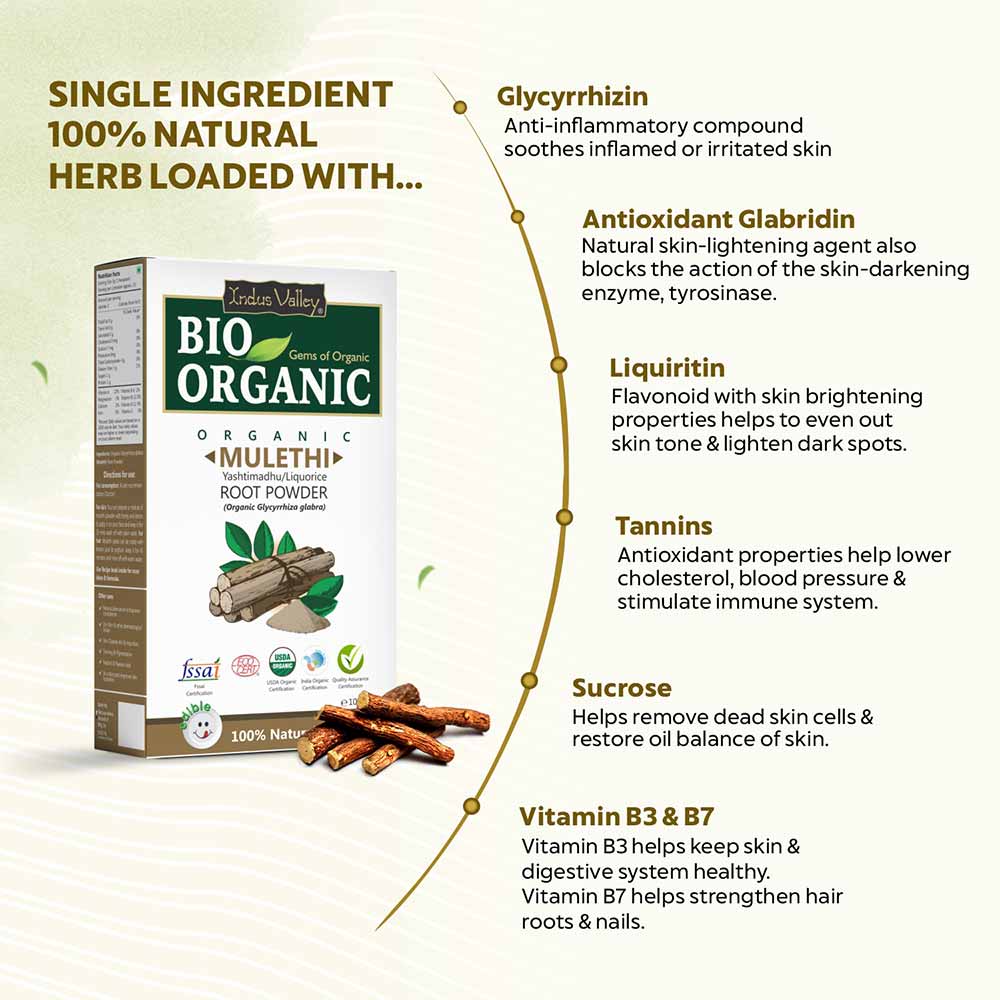 Bio-Organic Mulethi Root Powder is obtained from farm-fresh mulethi (Glycyrrhiza glabra) roots that are organically grown without the use of pesticides or fertilizer residues and handpicked by dedicated farmhands. Also Known as licorice powder or yashtimadhu powder, the roots are shade dried and then crushed to obtain the powder. Most people use licorice powder for their skin. Loaded with antioxidants and nutrients, it is highly beneficial in treating a variety of skin and hair ailments, remedies cough and cold, and also works as a natural immunity booster.
