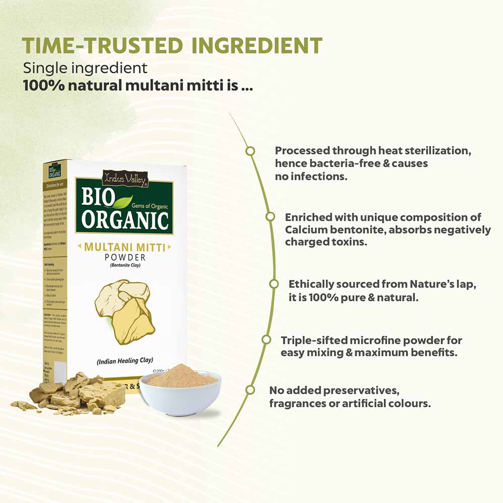 Multani mitti, also known internationally as Indian Healing Clay Powder, is a deep healer of acne and pimples, pulls out blackheads, reduces scars, blemishes, fine lines, and wrinkles, tightens up the skin, shrinks large open pores and brightens up the complexion. It also helps clean the scalp, clearing away dandruff and scalp flakes. Indus Valley Bio-Organic Multani Mitti Powder comes to you as the purest form of Indian Healing Clay for hair, deeply cleanse the scalp & pulls out all excess oil. Multani soil quickly draws out dead skin cells, accumulated oil, dirt, and grime trapped inside skin pores allowing the skin to breathe, increasing the skin’s collagen production, and giving you bright, glowing skin.