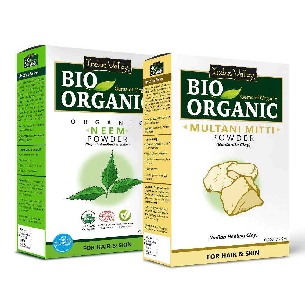 At Indus Valley, we continuouslytry to offer our customers the most beneficial combinations from our collection of certified natural ingredients. The neem powder and Multani mitti combo is a star pair as the products can be used for skincare as well as hair care. The antibacterial, antifungal, and anti-inflammatory properties of neem provide excellent healing and treats acne or pimples from the roots.