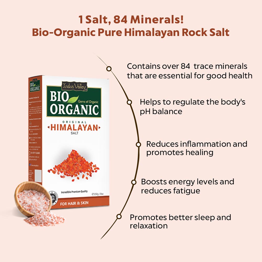 Indus Valley Bio-Organic Himalayan Salt, Contains over 84 beneficial minerals including iron, calcium, phosphorus, and magnesium, No added chemicals whatsoever; no colorants and artificial fragrances, Certified as edible by FSSAI, Cruelty-free, and vegan Himalayan salt.